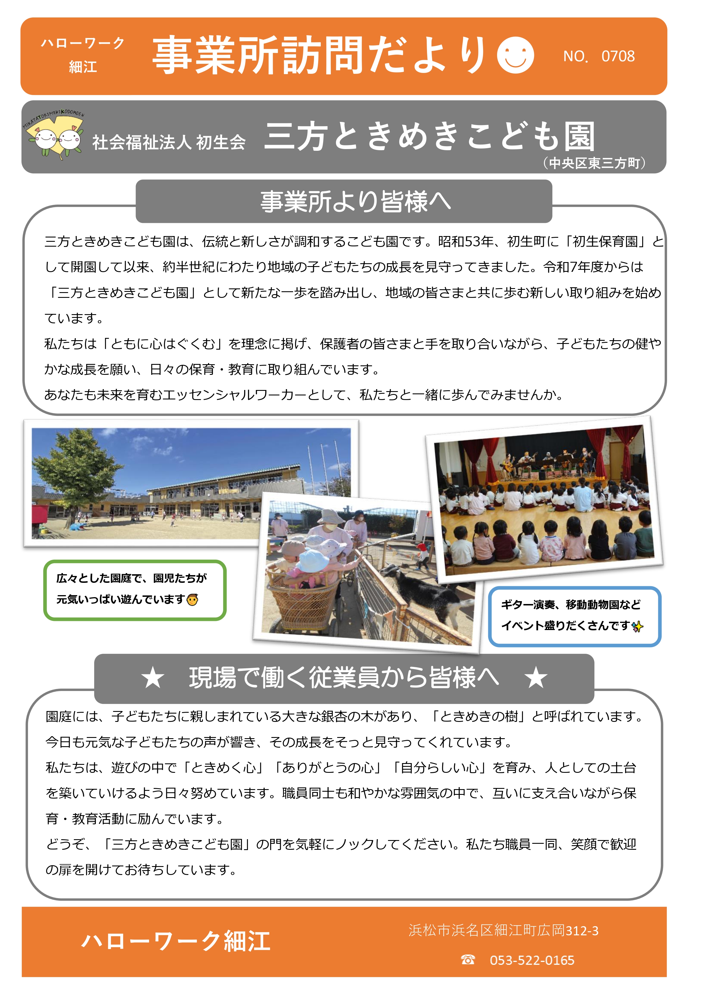 | 雇用条件 | いつでもお気軽にお問い合わせください ☏053-436-7102 面接や見学をご希望の場合は、日程調整いたします。 |